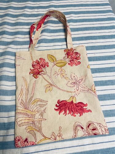 4年前、会社の近くにあるホテルのレストランにランチに行くことになり、お財布とスマホだけ入るようなバッグがないからと前日に慌てて作った手提げバッグ。 計画性なく作ったので持ち手が太すぎてバランスが悪かったのと、裏布をポイントにと上部で少し折り…